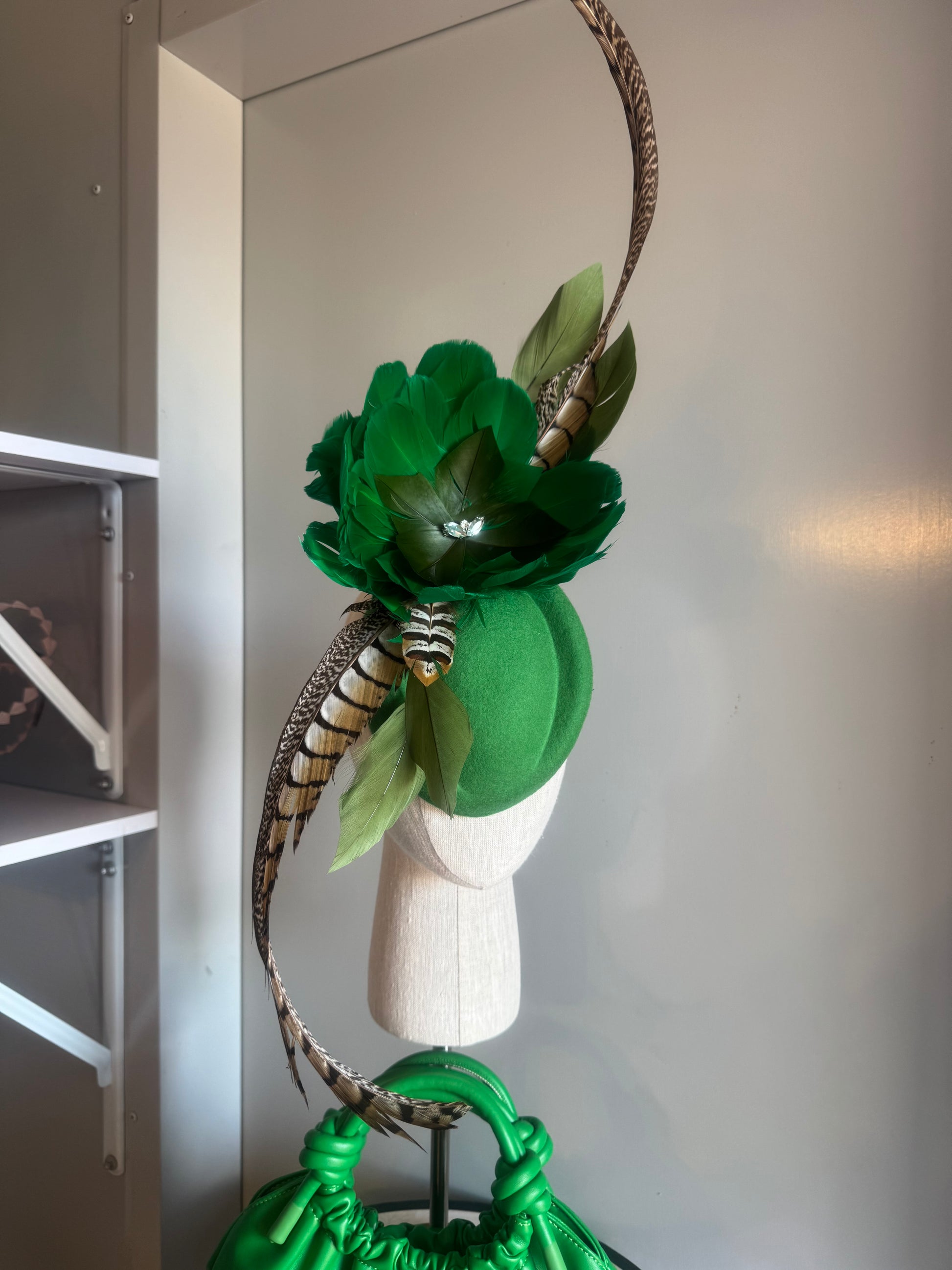 “Carla” Green feather statement felt/wool pillbox