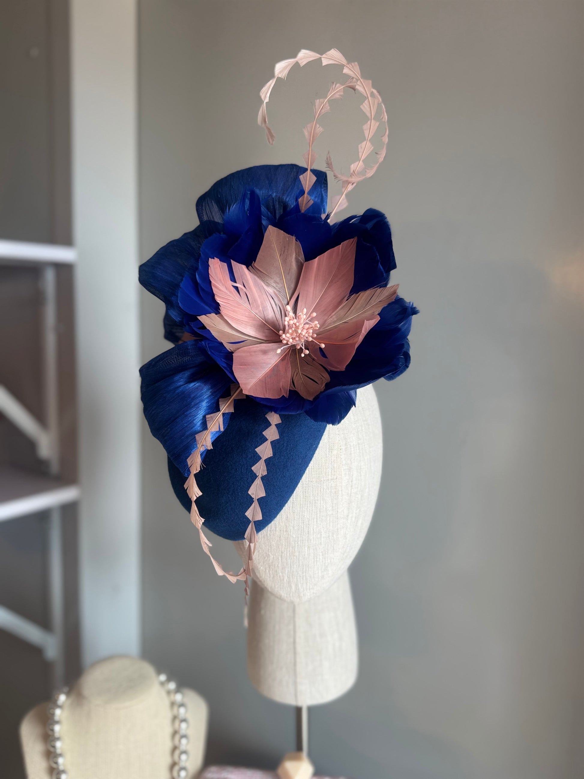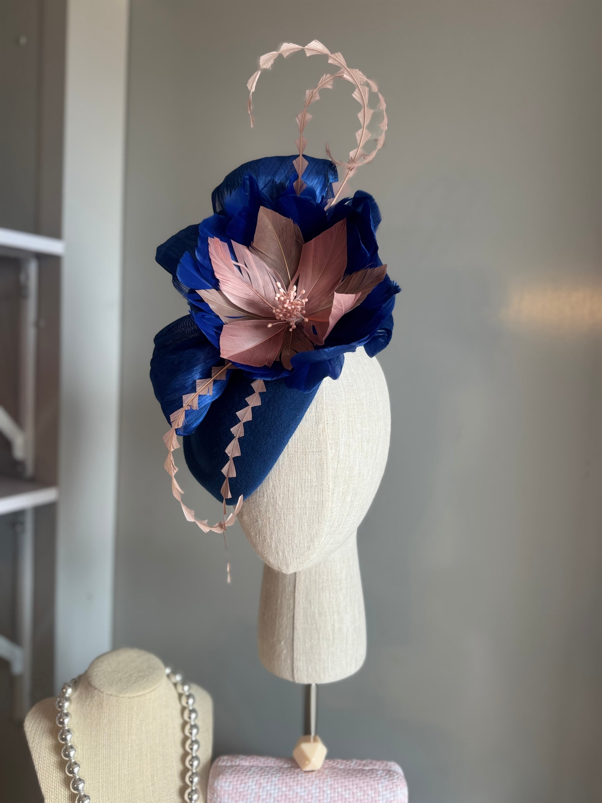 “Cynthea” blue,pink & latte feather pillbox